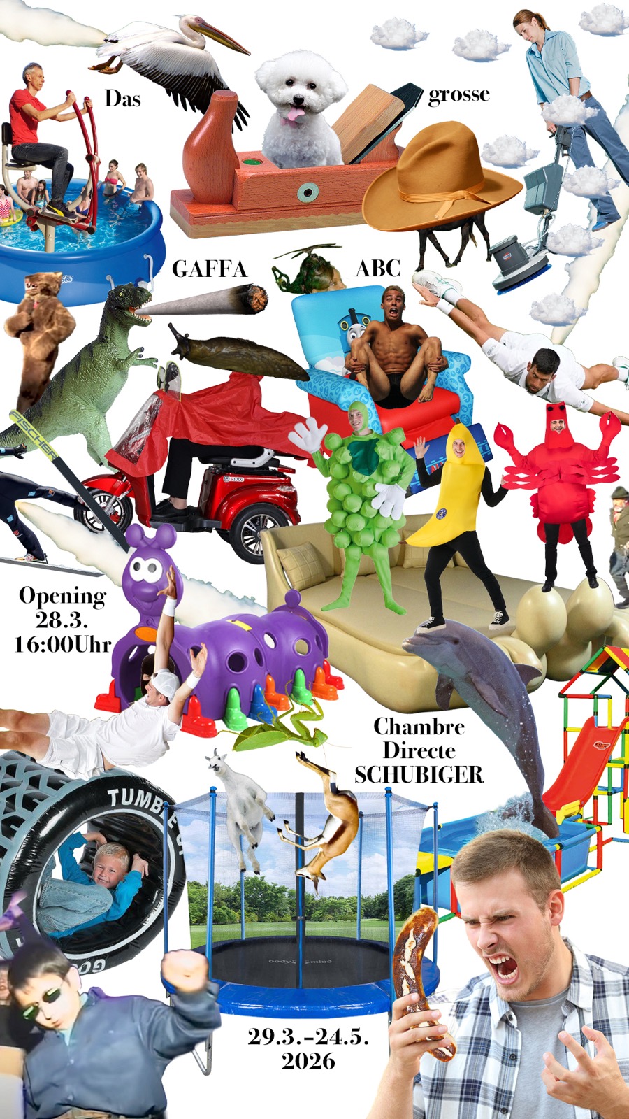 „Das Grosse GAFFA ABC“ zeigt in einer Videoinstallation das komplette, unfiltrierte Archiv der 100 Ausgaben GAFFAZine im Schnelldurchlauf. In der Gegenüberstellung zu dem bewegten Bild wird in einer Wandinstallation zum Blättern eingeladen: eine Auswahl aller Bildbeiträge, neu geordnet und kombiniert.